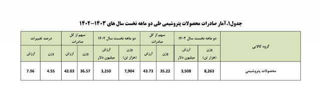 وی اظهار کرد: این میزان صادرات از نظر وزنی ۳۵ درصد و از نظر ارزشی ۴۴ درصد از صادرات غیرنفتی کشور را به خود اختصاص داده است.