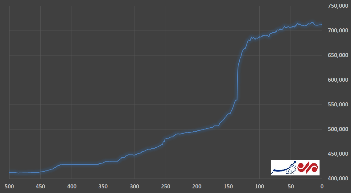 نمودار زیر روند افزایش قیمت اسکناس دلار آمریکا را در ۵۰۰ روز کاری گذشته نشان میدهد. در این مدت افزایش قیمت اسکناس دلار از ۴۱۲,۹۹۷ ریال تا ۷۱۹,۶۱۸ ریال بیانگر رشد بیش از ۷۲ درصدی (بیش از ۳۰ هزار تومانی) در این مدت است.