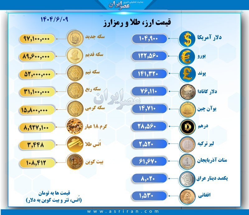 به گزارش سلام نو به نقل از عصرایران، در تاریخ ۹ شهریور ۱۴۰۴، قیمت دلار آمریکا به ۱۰۴ هزار و ۹۰۰ تومان، یورو به ۱۲2 هزار و 560 تومان و سکه جدید به ۹۷ میلیون و ۱۰۰ هزار تومان رسید. همچنین هر گرم طلای ۱۸ عیار ۸ میلیون و ۹۲۷ هزار تومان معامله شد.