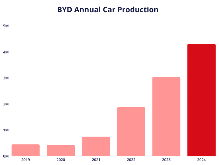 نمودار میزان تولید سالانه خودرو توسط شرکت BYD از سال ۲۰۱۹ تا ۲۰۲۴