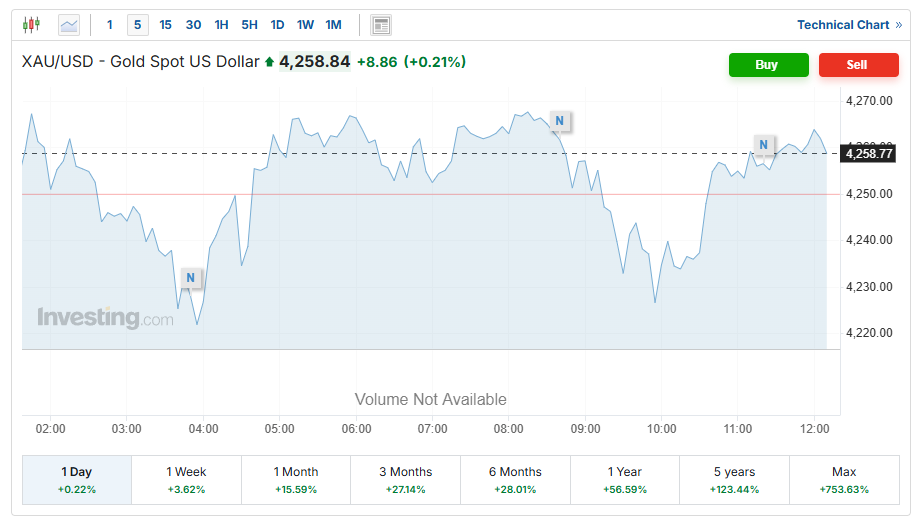 در ساعت 8 و 30 دقیقه به وقت ایران، هر اونس طلای اسپات با ۰.۳ درصد افزایش به ۴۲۵۹.۳۴ دلار رسید. همچنین، قراردادهای آتی طلای آمریکا برای تحویل در ماه دسامبر ۱.۴ درصد رشد داشت و به ۴۲۷۳ دلار در هر اونس رسید.
