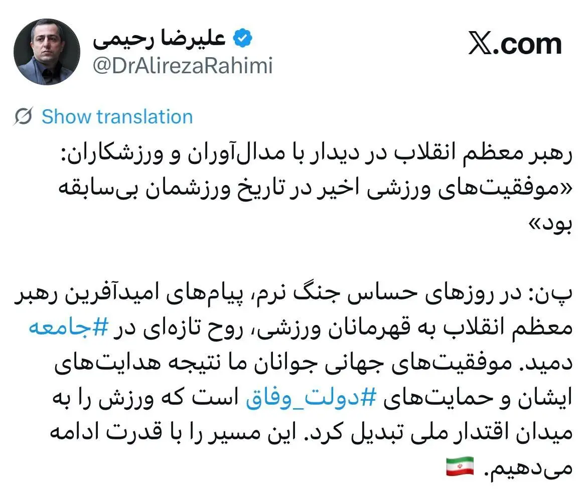 موفقیتهای جهانی جوانان ما نتیجه هدایتهای ایشان و حمایتهای #دولت_وفاق است که ورزش را به میدان اقتدار ملی تبدیل کرد. source راهبری نوشته فیلم/ نرخ عجیب خط فقر برای هر نفر اعلام شد ضربه سخت چین به آمریکا در جنگ تجاری