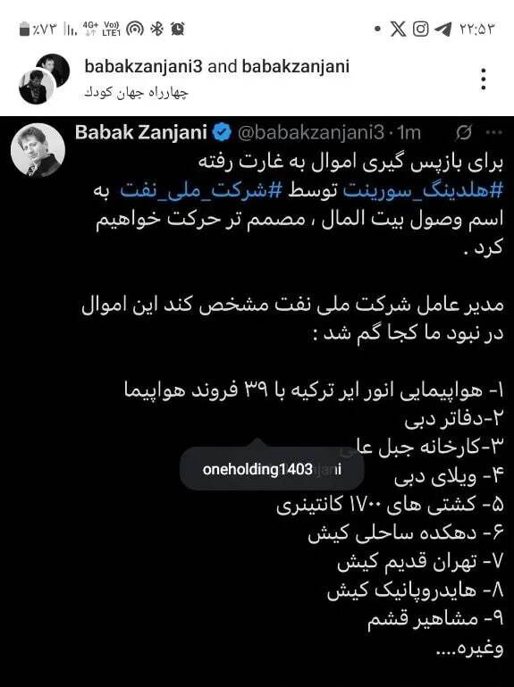 در پی این اظهارات معاون وزیر نفت واکنش نشان داده و در شبکه ایکس نوشته بود: برای بازپس گیری اموال به غارت رفته هلدینگ سورینت توسط شرکت ملی نفت به اسم وصول بیت المال، مصممتر حرکت خواهیم کرد. مدیر عامل شرکت ملی نفت مشخص کند این اموال در نبود ما کجا گم شد: ۱- هواپیمایی انور ایر ترکیه با ۳۹ فروند هواپیما ۲-دفاتر دبی ۳-کارخانه جبل علی ۴- ویلای دبی ۵- کشتیهای ۱۷۰۰ کانتینری ۶- دهکده ساحلی کیش ۷- تهران قدیم کیش ۸- هایدروپانیک کیش ۹- مشاهیر قشم وغیره….