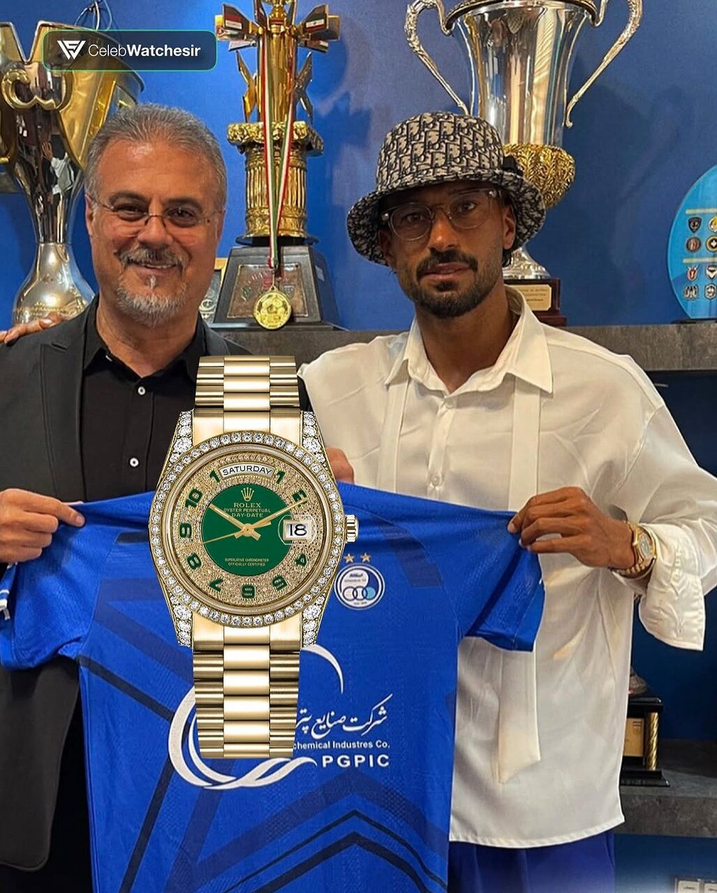 به گزارش اقتصادنیوز به نقل از خبرآنلاین، رامین رضائیان در زمان تمدید قرار با تیم استقلال، با یک ساعت رولکس بسیار خاص روی مچ دستش دیده شد. مدل ساعت Day Date 118388 که کیس و دستبند پرزیدنت آن از طلا ١٨ عیار ساخته شده و تا عمق ١٠٠ متر در برابر فشار آب مقاوم است. همچنین بزل این ساعت با ۵۲ برلیان و کیسش هم با ۳۲ الماس تراش برلیان تزیین شده است.