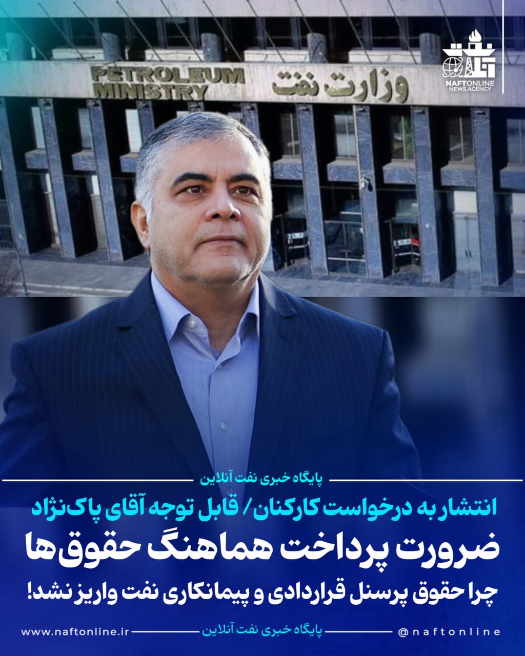 آقای پاک‌نژاد! چرا حقوق همه پرسنل رسمی، قراردادی و پیمانکاری صنعت نفت در یک روز و به‌صورت هماهنگ پرداخت نمی‌شود؟ امروز دوم آذرماه است و هنوز بخش قابل توجهی از پرسنل قراردادی و پیمانکاری حقوق خود را دریافت نکرده‌اند، در حالی که این افراد ستون‌های اصلی فعالیت‌های روزمره صنعت نفت هستند و تأخیر در پرداخت حقوق آنها، مشکلات متعددی را به دنبال دارد.
