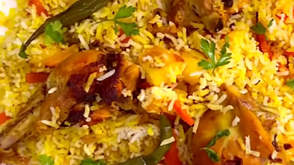 پیاز رو تفت بده تا طلایی شه، حالا به دلخواه سیر رنده شده رو بهش اضافه کن، بعد مرغ رو با فلفل سبز به پیاز اضافه کن و با حرارت ملایم  بذار تا نیم پز بشه. مرغ فقط نیم پز بشه و بقیه فرایند پخت لای برنج انجام میشه.