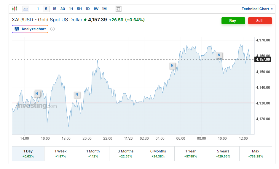 قیمت هر انس طلا نقدی (Spot) با افزایش 0.7 درصدی به 4,156.89 دلار رسید که بالاترین رقم از 14 نوامبر است. همچنین، قراردادهای آتی طلا برای تحویل در ماه دسامبر با 0.4 درصد افزایش به 4,154.10 دلار در هر انس رسید. این رشد در پی کاهش نگرانیها نسبت به ادامه سیاستهای سختگیرانه فدرال رزرو و به ویژه بر اساس ضعف دادههای اقتصادی اخیر آمریکا رخ داده است.