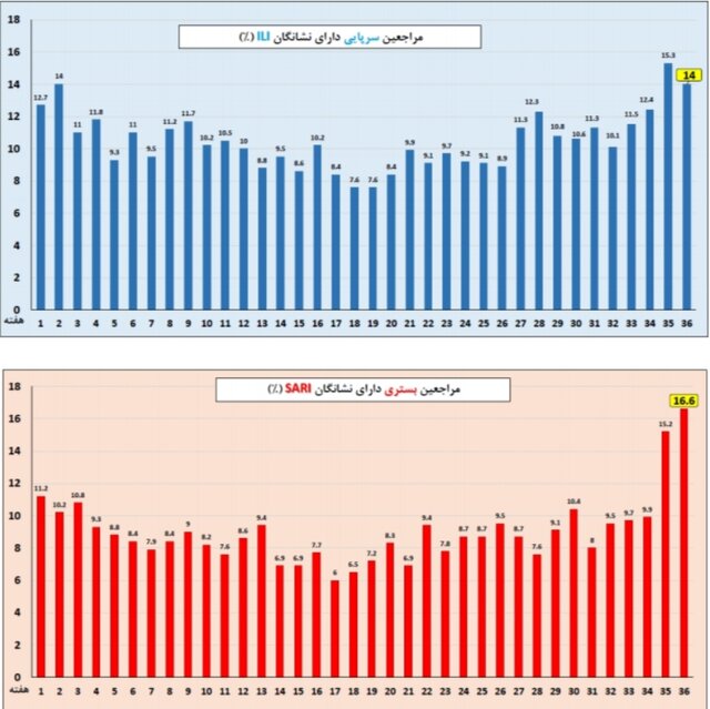 بر اساس داده‌های نظام مراقبت دیده‌وری تنفسی دو پاتوژن آنفلوانزا و کووید ۱۹ در هفته اول آذر ماه و بنابر اعلام مرکز مدیریت بیماری‌های واگیر وزارت بهداشت، نسبت موارد دارای علائم عفونت‌های تنفسی، همچنان در مراجعان بستری، در حال افزایش است؛ به نحوی که ۱۶.۶ درصد از موارد بستری دارای علائم تنفسی “SARI” هستند.