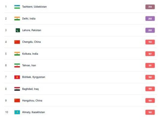 همچنین از این ۱۰ شهر ذکر شده، تاشکند در وضعیت خطرناک، دهلی و لاهور در وضعیت بسیار ناسالم و بقیه شهرها نیز در وضعیت ناسالم قرار دارند.