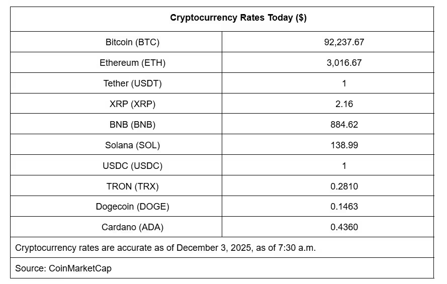 به گزارش Moneycontrol، بیتکوین در صبح روز 3 دسامبر کمی بالاتر از 92,854 دلار ایستاده بود و 7 درصد نسبت به جلسه قبلی افزایش داشت، این در حالی است که امیدوار بودند فدرال رزرو آمریکا در هفته آینده نرخ بهره را کاهش دهد. در جلسه صبح، این ارز دیجیتال بزرگترین کاهش خود را تجربه کرد و به 90,832 دلار رسید، اما پس از آن به تدریج بازگشت و در حدود 92,900 دلار تثبیت شد.