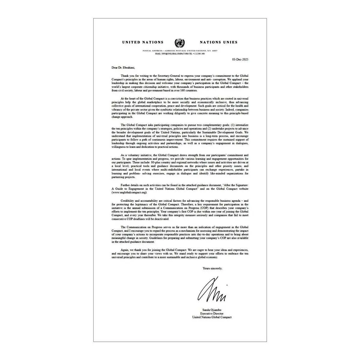 از اینکه به دبیرکل سازمان ملل متحد نامه نوشته و تعهد شرکت خود را نسبت به اصول پیمان جهانی در حوزههای حقوق بشر، کار، محیطزیست و مبارزه با فساد اعلام کردهاید، صمیمانه سپاسگزاریم. ما رهبری و تصمیم ارزشمند شما را ارج مینهیم و حضور شرکت شما را در پیمان جهانی (بزرگترین ابتکار و اقدام شهروندی شرکتی در جهان) با هزاران عضو از بخش های کسبوکار، جامعه مدنی، نیروی کار و دولت در بیش از ۱۶۰ کشور خوشآمد میگوییم.