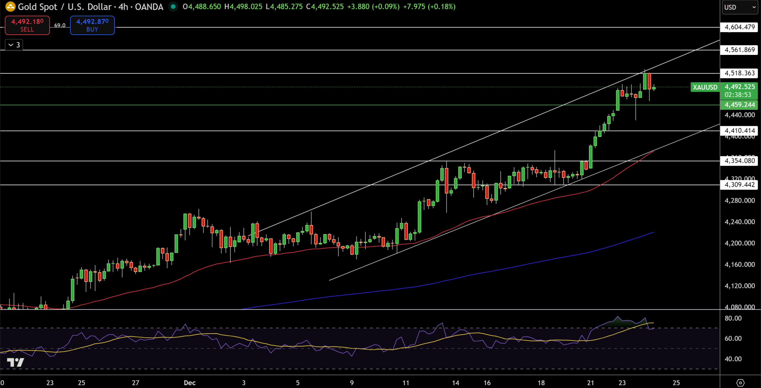طلا در محدوده ۴۴۹۲ دلار معامله شده و پس از یک رالی قدرتمند، وارد فاز تثبیت در نزدیکی سقف کانال صعودی شده است. روند غالب بازار همچنان صعودی بوده و ساختار کف‌ها و سقف‌های بالاتر، به ‌وضوح حفظ شده است.