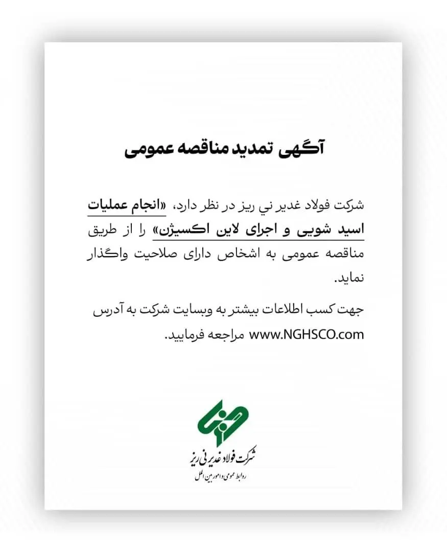 شرکت فولاد غدیر نی ریز در نظر دارد انجام عملیات اسیدشویی و اجرای لاین اکسیژن را از طریق مناقصه عمومی به اشخاص دارای صلاحیت واگذار نماید